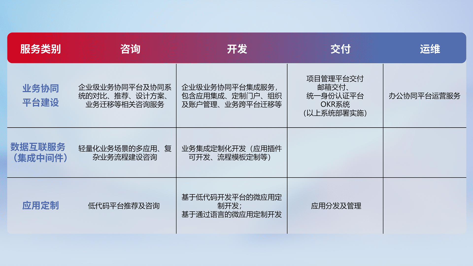针对钉钉、、、、企微、、、、IDaas等平台级产品提供产品的规划、、方案、、、交付、、定制化开发等服务,,,,实现如统一协同办公、、、智能客户服务、、混合会议管理、、、、智能数据查询、、等业务场景,,,实现数字化转型。。