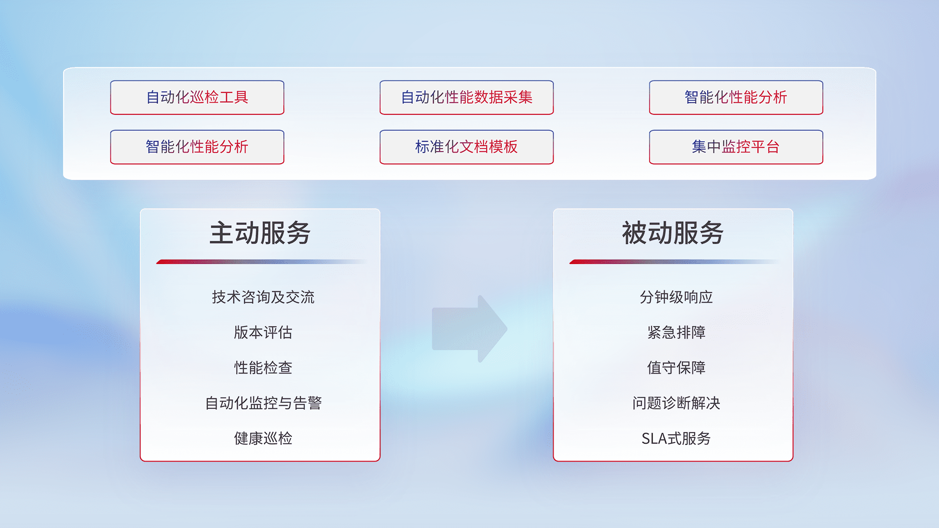 智能化工具和标准化文档,,,,保障服务质量,,,提供主动服务(包含技术咨询、、版本评估、、、、性能检查、、自动化监控与告警、、、健康巡检)和被动服务包含(分钟级响应、、、紧急排障、、、值守保障、、、问题诊断解决、、、、SLA服务)。。。。
